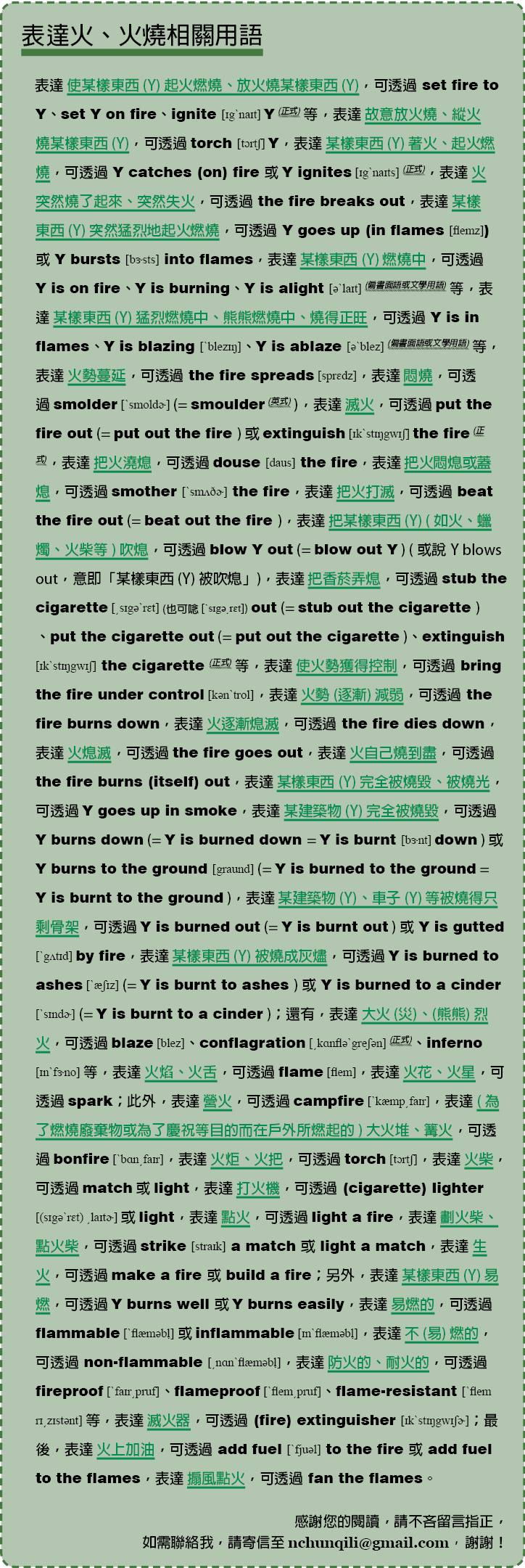 表達 使某樣東西 (Y) 起火燃燒、放火燒某樣東西 (Y),可透過 set fire to Y、set Y on fire、ignite [ɪgˋnaɪt] Y (正式) 等,表達 故意放火燒、縱火燒某樣東西 (Y),可透過 torch [tɔrtʃ] Y,表達 某樣東西 (Y) 著火、起火燃燒,可透過 Y catches (on) fire 或 Y ignites [ɪgˋnaɪts] (正式),表達 火突然燒了起來、突然失火,可透過 the fire breaks out,表達 某樣東西 (Y) 突然猛烈地起火燃燒,可透過 Y goes up (in flames [flemz]) 或 Y bursts [bɝsts] into flames,表達 某樣東西 (Y) 燃燒中,可透過 Y is on fire、Y is burning、Y is alight [əˋlaɪt] (偏書面語或文學用語) 等,表達 某樣東西 (Y) 猛烈燃燒中、熊熊燃燒中、燒得正旺,可透過 Y is in flames、Y is blazing [ˋblezɪŋ]、Y is ablaze [əˋblez] (偏書面語或文學用語) 等,表達 火勢蔓延,可透過 the fire spreads [sprɛdz],表達 悶燒,可透過 smolder [ˋsmoldɚ] (= smoulder (英式) ),表達 滅火,可透過 put the fire out (= put out the fire ) 或 extinguish the fire (正式),表達 把火澆熄,可透過 douse [daus] the fire,表達 把火悶熄或蓋熄,可透過 smother the fire,表達 把火打滅,可透過 beat the fire out (= beat out the fire ),表達 把某樣東西 (Y) ( 如火、蠟燭、火柴等 ) 吹熄,可透過 blow Y out (= blow out Y ) ( 或說 Y blows out,意即「某樣東西 (Y) 被吹熄」),表達 把香菸弄熄,可透過 stub the cigarette [͵sɪgəˋrɛt] (也可唸 [ˋsɪgə͵rɛt]) out (= stub out the cigarette )、put the cigarette out (= put out the cigarette )、extinguish the cigarette (正式) 等,表達 使火勢獲得控制,可透過 bring the fire under control [kənˋtrol],表達 火勢 (逐漸) 減弱,可透過 the fire burns down,表達 火逐漸熄滅,可透過 the fire dies down,表達 火熄滅,可透過 the fire goes out,表達 火自己燒到盡,可透過 the fire burns (itself) out,表達 某樣東西 (Y) 完全被燒毀、被燒光,可透過 Y goes up in smoke,表達 某建築物 (Y) 完全被燒毀,可透過 Y burns down (= Y is burned down = Y is burnt down ) 或 Y burns to the ground [graund] (= Y is burned to the ground = Y is burnt to the ground ),表達 某建築物 (Y)、車子 (Y) 等被燒得只剩骨架,可透過 Y is burned out (= Y is burnt out ) 或 Y is gutted by fire,表達 某樣東西 (Y) 被燒成灰燼,可透過 Y is burned to ashes [ˋæʃɪz] (= Y is burnt to ashes ) 或 Y is burned to a cinder [ˋsɪndɚ] (= Y is burnt to a cinder );還有,表達 大火 (災)、(熊熊) 烈火,可透過 blaze [blez]、conflagration [͵kɑnfləˋgreʃən] (正式)、inferno [ɪnˋfɝno] 等,表達 火焰、火舌,可透過 flame [flem],表達 火花、火星,可透過 spark;此外,表達 營火,可透過 campfire [ˋkæmp͵faɪr],表達 ( 為了燃燒廢棄物或為了慶祝等目的而在戶外所燃起的 ) 大火堆、篝火,可透過 bonfire [ˋbɑn͵faɪr],表達 火炬、火把,可透過 torch [tɔrtʃ],表達 火柴,可透過 match 或 light,表達 打火機,可透過 (cigarette) lighter [(sɪgəˋrɛt) ͵laɪtɚ] 或 light,表達 點火,可透過 light a fire,表達 劃火柴、點火柴,可透過 strike a match 或 light a match,表達 生火,可透過 make a fire 或 build a fire;另外,表達 某樣東西 (Y) 易燃,可透過 Y burns well 或 Y burns easily,表達 易燃的,可透過 flammable [ˋflæməbḷ] 或 inflammable [ɪnˋflæməbḷ],表達 不 (易) 燃的,可透過 non-flammable [͵nɑnˋflæməbḷ],表達 防火的、耐火的,可透過 fireproof [ˋfaɪr͵pruf]、flameproof [ˋflem͵pruf]、flame-resistant [ˋflem rɪ͵zɪstənt] 等,表達 滅火器,可透過 (fire) extinguisher [ɪkˋstɪŋgwɪʃɚ];最後,表達 火上加油,可透過 add fuel to the fire 或 add fuel to the flames,表達 搧風點火,可透過 fan the flames。