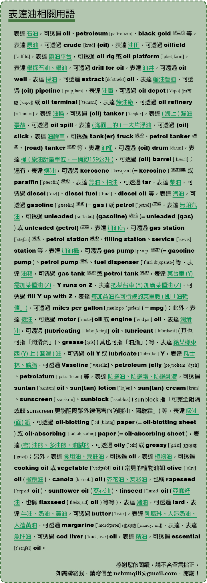 表達 石油,可透過 oil、petroleum [pəˋtrolɪəm]、black gold (非正式) 等,表達 原油,可透過 crude [krud] (oil),表達 油田,可透過 oilfield [ˋɔɪlfild],表達 鑽油平台,可透過 oil rig 或 oil platform [ˋplæt͵fɔrm],表達 鑽探石油、鑽油,可透過 drill for oil,表達 油井,可透過 oil well,表達 採油,可透過 extract [ɪkˋstrækt] oil,表達 輸油管道,可透過 (oil) pipeline [ˋpaɪp͵laɪn],表達 油庫,可透過 oil depot [ˋdipo] (也可唸 [ˋdɛpo]) 或 oil terminal [ˋtɝmənḷ],表達 煉油廠,可透過 oil refinery [rɪˋfaɪnərɪ],表達 油輪,可透過 (oil) tanker [ˋtæŋkɚ],表達 ( 海上 ) 漏油事故,可透過 oil spill,表達 ( 海面上的 ) 一大片浮油,可透過 (oil) slick,表達 油罐車,可透過 tank(er) truck (美式)、petrol tanker (英式)、(road) tanker (英式) 等,表達 油桶,可透過 (oil) drum [drʌm],表達 桶 ( 原油計量單位,一桶約159公升 ),可透過 (oil) barrel [ˋbærəl];還有,表達 煤油,可透過 kerosene [ˋkɛrə͵sin] (= kerosine ) (美式為主) 或 paraffin [ˋpærəfɪn] (英式) ,表達 焦油、柏油,可透過 tar,表達 柴油,可透過 diesel [ˋdizḷ]、diesel fuel [ˋfjuəl]、diesel oil 等,表達 汽油,可透過 gasoline [ˋgæsəlin] (美式) (= gas ) 或 petrol [ˋpɛtrəl] (英式),表達 無鉛汽油,可透過 unleaded (gasoline) (美式) (= unleaded (gas) ) 或 unleaded (petrol) (英式),表達 加油站,可透過 gas station (美式)、petrol station (英式)、filling station、service station 等,表達 加油機,可透過 gas pump [pʌmp] (美式) (= gasoline pump )、petrol pump (英式)、fuel dispenser [ˋfjuəl dɪ͵spɛnsɚ] 等,表達 油箱,可透過 gas tank (美式) 或 petrol tank (英式),表達 某台車 (Y) 需加某種油 (Z),Y runs on Z,表達 把某台車 (Y) 加滿某種油 (Z),可透過 fill Y up with Z,表達 每加侖油料可行駛的英里數 ( 即「油耗值」),可透過 miles per gallon [͵maɪlz pɚ ˋgælən] ( = mpg );此外,表達 機油,可透過 motor oil 或 engine oil,表達 潤滑油,可透過 (lubricating) oil、lubricant ( 其也可指「潤滑劑」)、grease ( 其也可指「油脂」) 等,表達 給某樣東西 (Y) 上 ( 潤滑 ) 油,可透過 oil Y 或 lubricate [ˋlubrɪ͵ket] Y,表達 凡士林、礦脂,可透過 Vaseline [ˋvæsəlin]、petroleum jelly [pə͵trolɪəm ˋdʒɛlɪ]、petrolatum [͵pɛtrəˋletəm] 等,表達 防曬油、防曬霜、防曬乳液,可透過 suntan oil、sun(tan) lotion、sun(tan) cream、sunscreen、sunblock ( sunblock 指「可完全阻隔或較 sunscreen 更能阻隔紫外線傷害的防曬油、隔離霜」) 等,表達 吸油 (面) 紙,可透過 oil-blotting paper (= oil-blotting sheet ) 或 oil-absorbing paper (= oil-absorbing sheet ),表達 (含) 油的、多油的、油膩的,可透過 oily [ˋɔɪlɪ] 或 greasy [ˋgrisɪ] (也可唸 [ˋgrizɪ]);另外,表達 食用油、烹飪油,可透過 oil,表達 植物油,可透過 cooking oil 或 vegetable oil ( 常見的植物油如 olive oil ( 橄欖油 )、canola oil ( 芥花油、菜籽油,也稱 rapeseed oil )、sunflower oil ( 葵花油 )、linseed oil ( 亞麻籽油,也稱 flaxseed oil ) 等等 ),表達 豬油,可透過 lard,表達 牛油、奶油、黃油,可透過 butter [ˋbʌtɚ],表達 乳瑪琳、人造奶油、人造黃油,可透過 margarine [ˋmɑrdʒərən] (也可唸 [͵mɑrdʒəˋrin]),表達,表達 魚肝油,可透過 cod liver oil,表達 精油,可透過 essential oil。