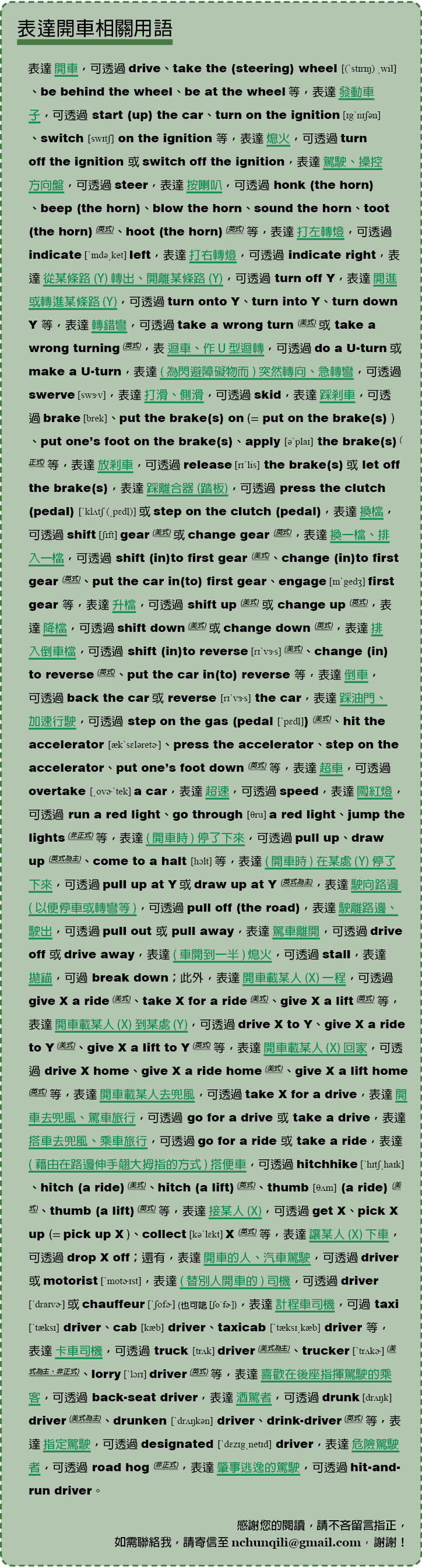 表達 開車,可透過 drive、take the (steering) wheel [(ˋstɪrɪŋ) ͵wil]、be behind the wheel、be at the wheel 等,表達 發動車子,可透過 start (up) the car、turn on the ignition [ɪgˋnɪʃən]、switch on the ignition 等,表達 熄火,可透過 turn off the ignition 或 switch off the ignition,表達 駕駛、操控方向盤,可透過 steer,表達 按喇叭,可透過 honk (the horn)、beep (the horn)、blow the horn、sound the horn、toot (the horn) (英式)、hoot (the horn) (英式) 等,表達 打左轉燈,可透過 indicate left,表達 打右轉燈,可透過 indicate right,表達 從某條路 (Y) 轉出、開離某條路 (Y),可透過 turn off Y,表達 開進或轉進某條路 (Y),可透過 turn onto Y、turn into Y、turn down Y 等,表達 轉錯彎,可透過 take a wrong turn (美式) 或 take a wrong turning (英式),表 迴車、作 U 型迴轉,可透過 do a U-turn 或 make a U-turn,表達 ( 為閃避障礙物而 ) 突然轉向、急轉彎,可透過 swerve [swɝv],表達 打滑、側滑,可透過 skid,表達 踩剎車,可透過 brake [brek]、put the brake(s) on (= put on the brake(s) )、put one’s foot on the brake(s)、apply [əˋplaɪ] the brake(s) (正式) 等,表達 放剎車,可透過 release the brake(s) 或 let off the brake(s),表達 踩離合器 (踏板),可透過 press the clutch (pedal) [ˋklʌtʃ (͵pɛdḷ)] 或 step on the clutch (pedal),表達 換檔,可透過 shift gear (美式) 或 change gear (英式),表達 換一檔、排入一檔,可透過 shift (in)to first gear (美式)、change (in)to first gear (英式)、put the car in(to) first gear、engage first gear 等,表達 升檔,可透過 shift up (美式) 或 change up (英式),表達 降檔,可透過 shift down (美式) 或 change down (英式),表達 排入倒車檔,可透過 shift (in)to reverse [rɪˋvɝs] (美式)、change (in)to reverse (英式)、put the car in(to) reverse 等,表達 倒車,可透過 back the car 或 reverse the car,表達 踩油門、加速行駛,可透過 step on the gas (pedal [ˋpɛdḷ]) (美式)、hit the accelerator [ækˋsɛləretɚ]、press the accelerator、step on the accelerator、put one’s foot down (英式) 等,表達 超車,可透過 overtake a car,表達 超速,可透過 speed,表達 闖紅燈,可透過 run a red light、go through a red light、jump the lights (非正式) 等,表達 ( 開車時 ) 停了下來,可透過 pull up、draw up (英式為主)、come to a halt [hɔlt] 等,表達 ( 開車時 ) 在某處 (Y) 停了下來,可透過 pull up at Y 或 draw up at Y (英式為主),表達 駛向路邊 ( 以便停車或轉彎等 ),可透過 pull off (the road),表達 駛離路邊、駛出,可透過 pull out 或 pull away,表達 駕車離開,可透過 drive off 或 drive away,表達 ( 車開到一半 ) 熄火,可透過 stall,表達 拋錨,可過 break down;此外,表達 開車載某人 (X) 一程,可透過 give X a ride (美式)、take X for a ride (美式)、give X a lift (英式) 等,表達 開車載某人 (X) 到某處 (Y),可透過 drive X to Y、give X a ride to Y (美式)、give X a lift to Y (英式) 等,表達 開車載某人 (X) 回家,可透過 drive X home、give X a ride home (美式)、give X a lift home (英式) 等,表達 開車載某人去兜風,可透過 take X for a drive,表達 開車去兜風、駕車旅行,可透過 go for a drive 或 take a drive,表達 搭車去兜風、乘車旅行,可透過 go for a ride 或 take a ride,表達 ( 藉由在路邊伸手翹大拇指的方式 ) 搭便車,可透過 hitchhike [ˋhɪtʃ͵haɪk]、hitch (a ride) (美式)、hitch (a lift) (英式)、thumb (a ride) (美式)、thumb (a lift) (英式) 等,表達 接某人 (X),可透過 get X、pick X up (= pick up X )、collect [kəˋlɛkt] X (英式) 等,表達 讓某人 (X) 下車,可透過 drop X off;還有,表達 開車的人、汽車駕駛,可透過 driver 或 motorist [ˋmotɚɪst],表達 ( 替別人開車的 ) 司機,可透過 driver [ˋdraɪvɚ] 或 chauffeur [ˋʃofɚ] (也可唸 [ʃoˋfɚ]),表達 計程車司機,可過 taxi driver、cab driver、taxicab driver 等,表達 卡車司機,可透過 truck driver (美式為主)、trucker (美式為主、非正式)、lorry driver (英式) 等,表達 喜歡在後座指揮駕駛的乘客,可透過 back-seat driver,表達 酒駕者,可透過 drunk driver (美式為主)、drunken driver、drink-driver (英式) 等,表達 指定駕駛,可透過 designated driver,表達 危險駕駛者,可透過 road hog (非正式),表達 肇事逃逸的駕駛,可透過 hit-and-run driver。